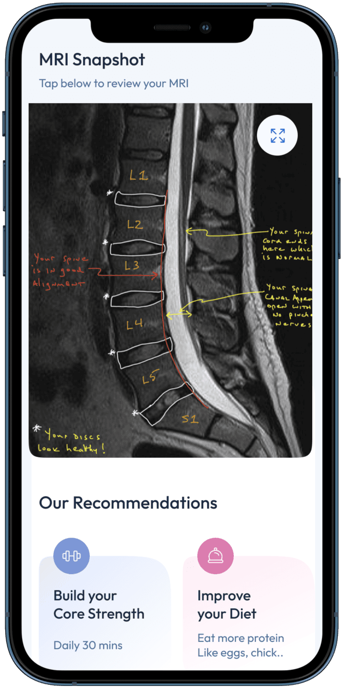 There are two parts to an MRI scan. One part is the MRI report – which is a document produced by the radiologist who read the study for the imaging center. Unfortunately, the MRI report is usually filled with so much medical jargon that a patient is unable to understand it. Another part of the MRI is the scan itself – which is the images a spine surgeon would use to decide what treatment to recommend. Spinely helps patients understand both of these parts by reviewing the MRI and providing a report in plain English and we also show the patient a key image from their MRI and explain the findings. Most importantly, Spinely gives the patient an understanding of whether or not their MRI shows a problem that should (or should NOT) be treated with surgery.