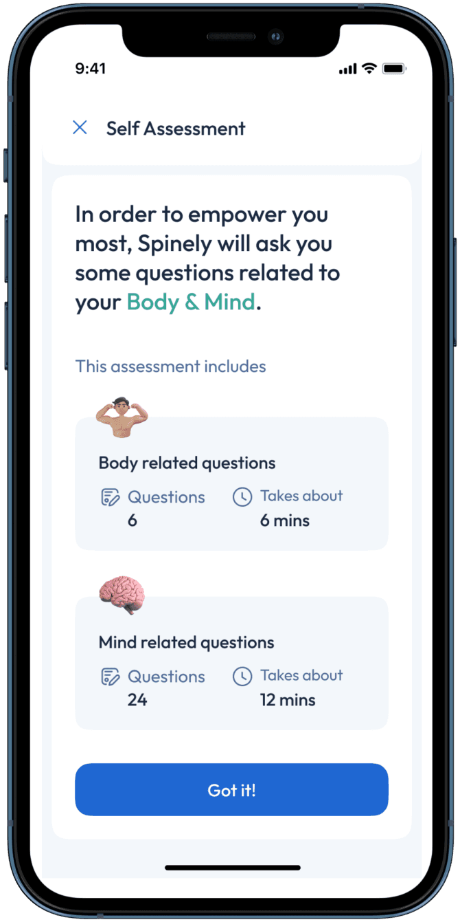 The Spinely platform empowers you to take control of your care. First, we let you assess and understand your symptoms. Then, we inform you about care options and whether surgery is likely to help or harm you. Ultimately, our goal is to give you the confidence and information to make the right decision